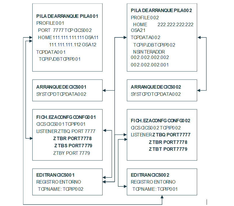 La transid ZTBQ de CICS001 se tendría que quedar escuchando llamadas entrantes por el puerto 7777 de la dirección 111.111.111.111 y 111.111.111.112, puesto que en el registro CICS del EZACONFG se especificó TCPIP001, y por tanto tira de la PILA001, que tiene dicho TCPIPJOBNAME = TCPIP001, en su TCPDATA001, sacando la dirección local de la macro HOME del PROFILE001. Sin embargo, como en dicha PILA001 se especifica en el PROFILE001 el PORT 7777 asignado a CICS002, no va a ser posible la activación del LISTENER descrito, puesto que está asignado a otro CICS (ERRNO 13 ó permiso denegado). Si un remoto llama a dicha dirección y puerto le dará un error de connect 61 (no existe LISTENER activo)